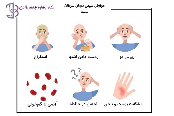 همچنین باید آگاه بود شیمی درمانی ممکن است عوارض جانبی همچون ریزش مو، تغییرات ناخن، زخم های دهان، از دست دادن اشتها یا تغییر وزن، تهوع و استفراغ، اسهال به همراه داشته باشد. که این عوارض به نوع و دوز داروهای داده شده و طول مدت درمان بستگی دارد.